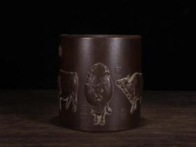 老紫砂笔筒 紫砂五牛图笔筒摆件