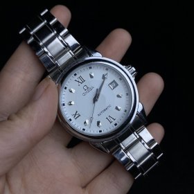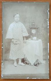 1920年代火棉胶纸基照片,相纸平滑挺阔,纸基坚韧,聚焦精准,清晰度极高,站立男子持花束,戴手表着衬衫衣白马褂。照片画面有磨损及污点,直边直角无折损。