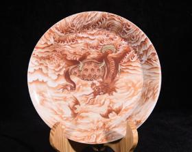 大清乾隆唐英三儒堂款矾红描金龙龟驼龙赑屃纹笔洗茶盘
