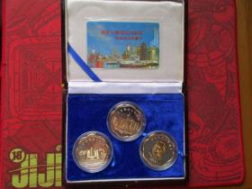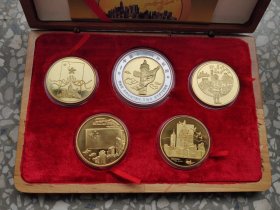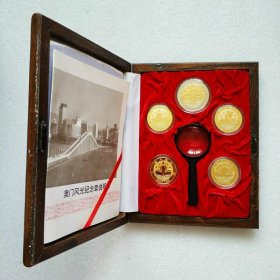 澳门风光:“迎接九九澳门回归祖国”纪念章一套5枚.纪念章为铜质镀金镀银。分别是:1.澳氹大桥2.市政厅3.铜马广场4.葡京大酒店5.牌坊圣迹。木盒包装