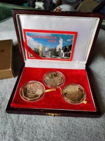 【香港纪念章】少见沈阳造币厂1997年香港回归祖国铜纪念章,五枚一套,中间双色章50毫米,另四枚40毫米,官方出品,实木盒包装,非常精美,盒证书齐全,喜欢的别错过!