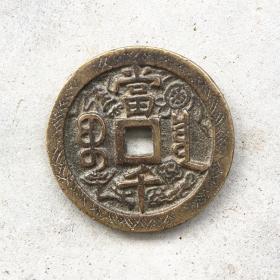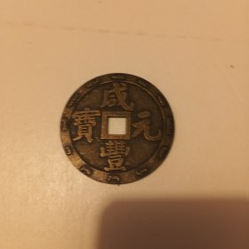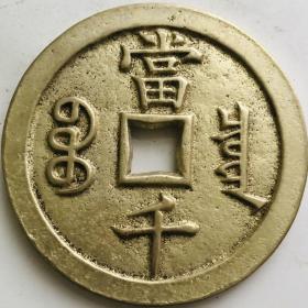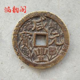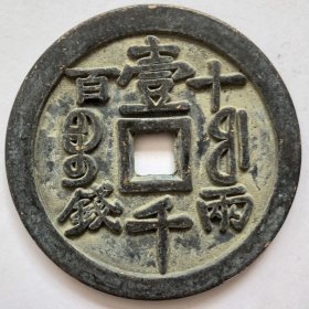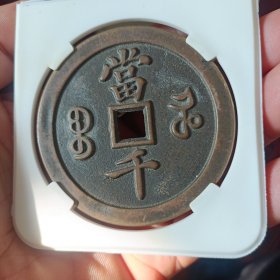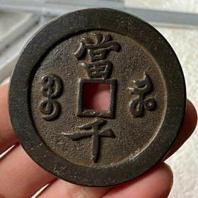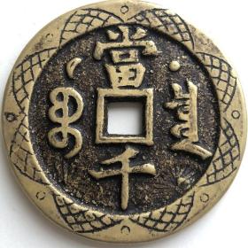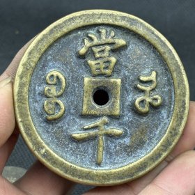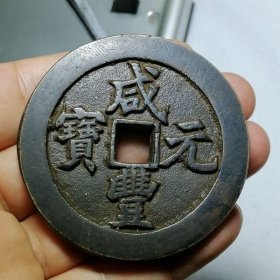清代咸丰元宝当千铜钱一枚,品相如图,字口清晰,包浆自然。正面"咸丰元宝",背面"当千",铜质厚重。重量111克,直径5.7厘米。边道完整,声音极好,适合收藏。