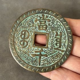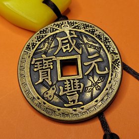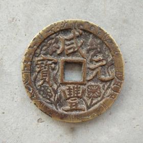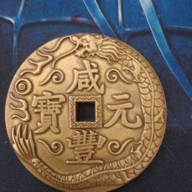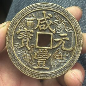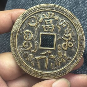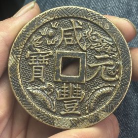 清代黄亮黄铜精雕龙凤呈祥清代宝源局咸丰元宝当千龙凤铜板大花钱。直径七厘米,重107克。品相完好,字口清晰,龙凤雕刻精美,花纹清晰。铜质厚重,包浆自然。