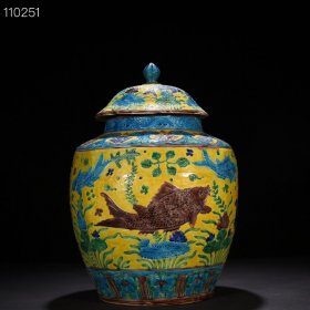 明嘉靖黄地珐华彩鱼藻纹方将军罐 46*28厘米