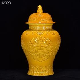 清乾隆年黄釉雕刻寿纹将军罐