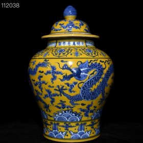 明万历黄地青花龙纹将军罐,高46cm直径31cm