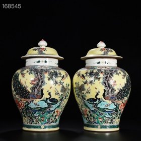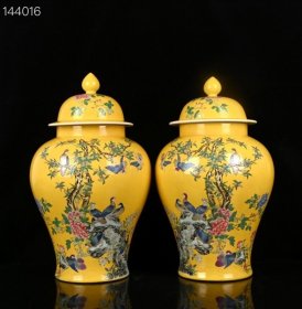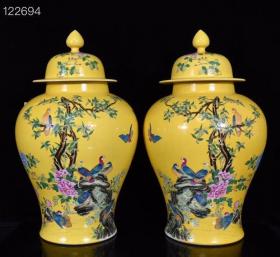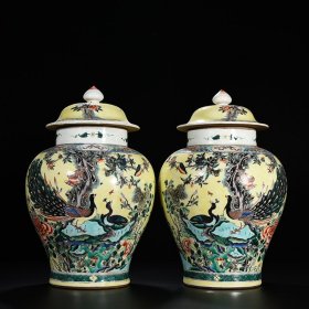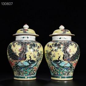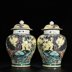 清康熙黄地五彩孔雀花卉纹将军罐 40*25厘米
