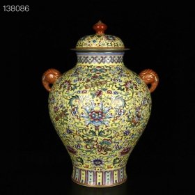 清乾隆黄地珐琅彩描金缠枝八宝纹象耳将军罐