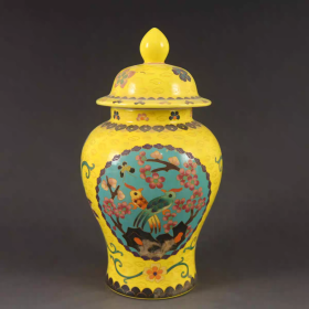 明代成化瓷胎掐丝珐琅彩黄地开窗花鸟将军罐