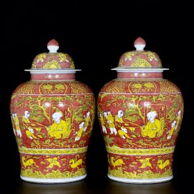 明万历红底黄彩婴戏纹将军罐 53/33厘米