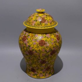 清雍正黄釉底粉彩花鸟将军罐