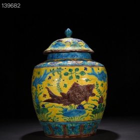 明嘉靖黄地珐华彩鱼藻纹方将军罐