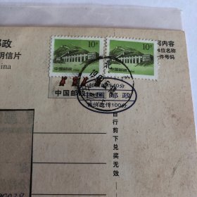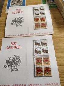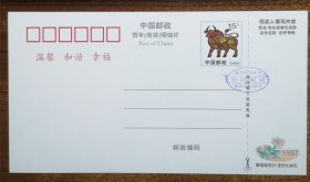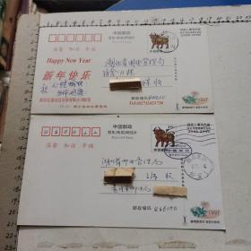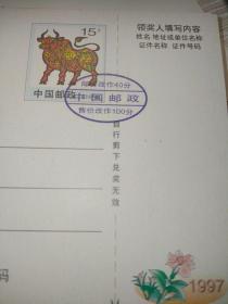 实寄邮资片:中国邮政贺年(有奖)明信片 牛年(1997年)实寄2枚一组:改值丶未改值各一枚 、改值片钤机截、 双戳较清晰 见书影及描述