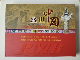 第五套人民币同号钞珍藏册1册,盛世中国,2005年发行,含6张彩银微缩,6张粮票,6张邮票,3枚硬币,空缺纸币,原封原套,品相完好