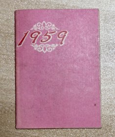 1959年日历本,粉色封面配白色花纹图案,内页有每月日历表和花卉图案。