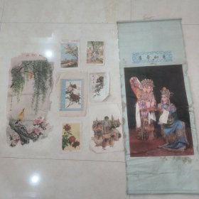 五六十年代印刷挂画和画片,侯碧漪花鸟屏(残),金梅生绘庵堂相会画片(折痕品一般),蓓蕾初开贵妃醉酒挂图(有污渍折痕和破裂,内容还算完整),和一些剪画片,没有什么收藏价值可以拿回去当做研究学习材料。