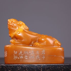 珍品田黄石印章精雕·招财麒麟·老闲章 透料麦芽黄精雕瑞兽呈祥 石质温润通透 萝卜纹清晰细腻。黄士陵 作 净高14.5厘米长5厘米厚5厘米净重710克
