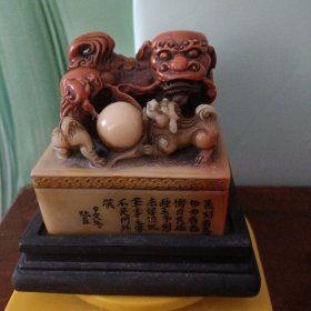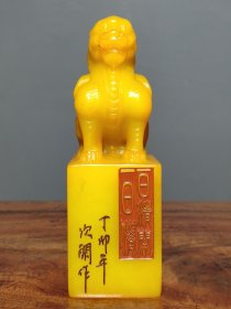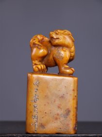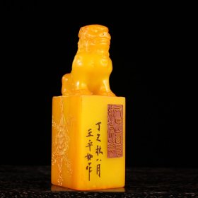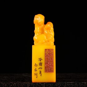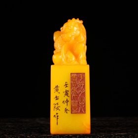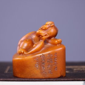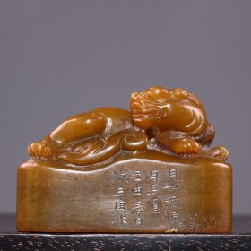 珍品田黄石印章精雕·仰天吼·老闲章 透料麦芽黄精雕瑞兽呈祥 石质温润通透 萝卜纹清晰细腻。 净高14.5厘米长5厘米厚5厘米净重780克
