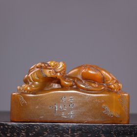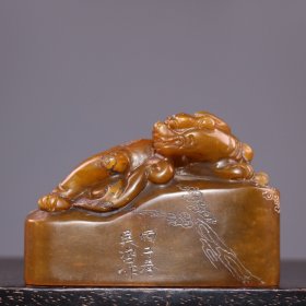 珍品田黄石印章精雕·古龙神兽·老闲章 透料麦芽黄精雕瑞兽呈祥 石质温润通透 萝卜纹清晰细腻。 高14.5厘米长5厘米厚5厘米重794克
