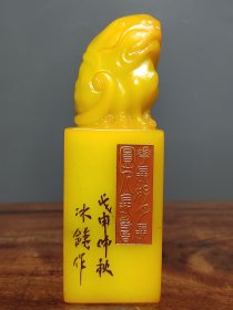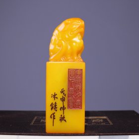 珍品田黄石印章精雕·古龙神兽·老闲章 透料麦芽黄精雕瑞兽呈祥 石质温润通透 萝卜纹清晰细腻。 高14.5厘米长5厘米厚5厘米重660克 錾刻名家:丁卯年•次闲作