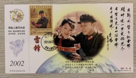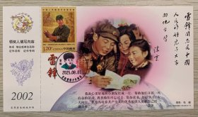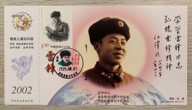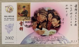 挂像英模【雷锋】金卡极限、沈阳雷锋少年邮局套色文化日戳(仅用一天就回收);首日票前片(雷锋系红领巾);彩戳清晰完整-2002生肖马年60分中国邮政贺年有奖邮资明信片企业金卡拜年卡贺卡极限片