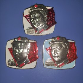 毛主席像章 出头八角帽头像,红旗带隐形诗词,背文4203,彩色异形像章。三枚合售@