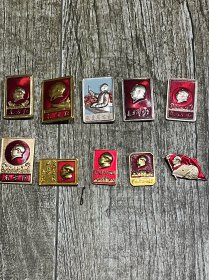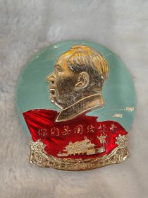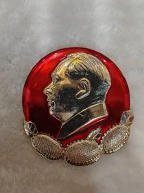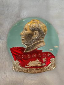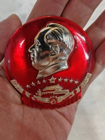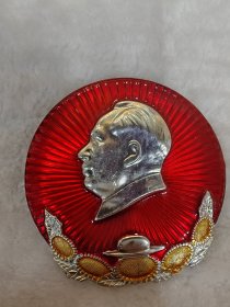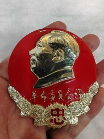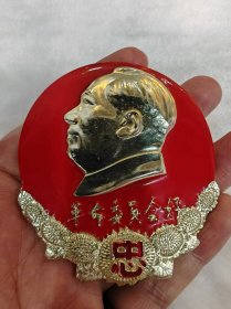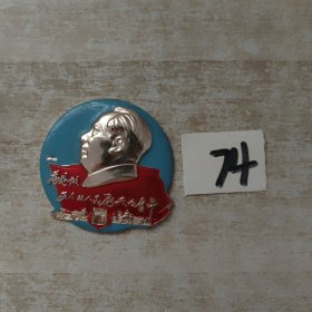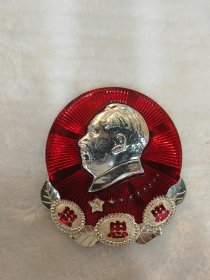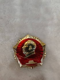 毛主席异形像章(工人阶级永远忠于毛主席)红底放光芒,银色头像,三个“忠”字三多葵花,九颗星,异形像章;背面:我们工人阶级永远忠于毛主席;尺寸:7cm*8cm(C133)