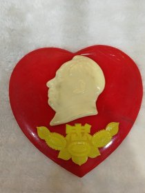 毛主席像章摆件(异形桃心形状,合肥)红底,头像,“忠”字,三葵花,背面:“永远忠于毛主席、毛泽东思想、革命路线”,合肥市革命委员会敬赠,皖3-01;尺寸:12.6cm尺寸详见图片(C99)