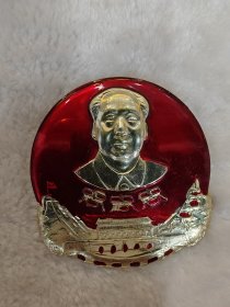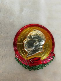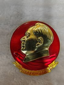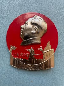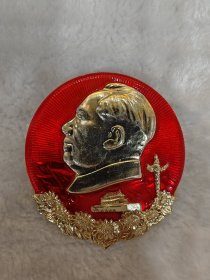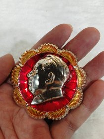 毛主席异形像章(党的九大纪念章)红底金色立体头像,放光芒,党旗,金色彩带托底;背面:党的第九次全国代表大会万岁,8231;尺寸:6.4cm,6.9cm(C148)