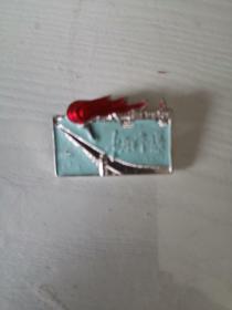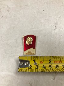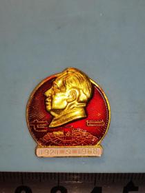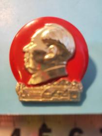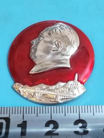 异形毛主席像章 (万岁 圣地 章 广州)金色头像 下部 延安宝塔山 延河大桥 红底 背文 毛泽东思想胜利万岁 中国 广州 直径 3.*3.5cm 照片若有阴影 乃是拍照光线所致。