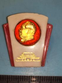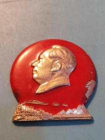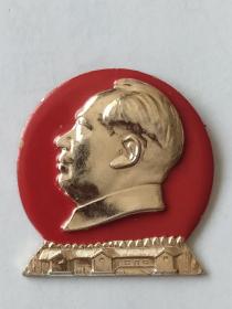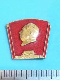 异形毛主席像章 (万岁 圣地 章 北京红旗证章厂)金色头像 下部 天安门 红底放光芒 金色外圈 背文 毛主席万岁!北京红旗证章厂 直径 2*2cm 照片若有阴影 乃是拍照光线所致。稀少。