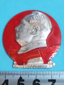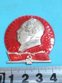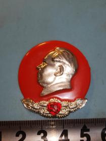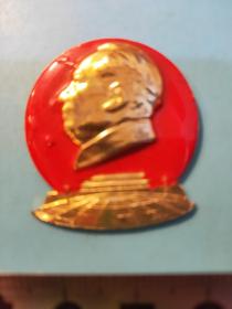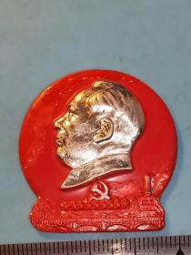 异形毛主席像章 (纪念九大 章 )金色头像 下部 红旗 党徽 红宝书 红底放光芒 直径 3.5*4cm 背文 九大万岁 照片若有阴影 乃是拍照光线所致。