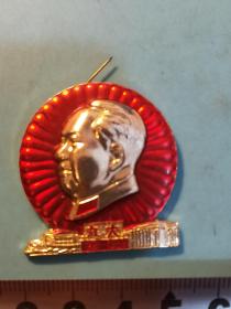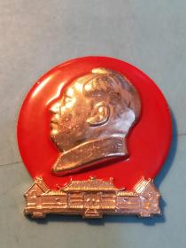 异形毛主席像章 ( 万岁 圣地章 ) 金色头像像章 下部 红旗 天安门 梅花 背文 毛主席万岁 直径 3.7cm 照片若有阴影 乃分局是拍照光线所致 稀少