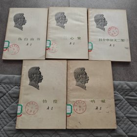 《伪自由书》《二心集》《且介亭杂文二集》《彷徨》《呐喊》 - 作者:鲁迅(署名“鲁迅” ) - 其他信息:书籍带有馆藏印章(如“汉寿县教师进修学校 资料室” 等),属于经典文学作品,《呐喊》《彷徨》是小说集,其余多为杂文集,展现鲁迅不同创作阶段的思想与文学风格