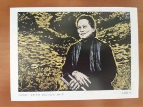 宋庆龄明信片。主图为著名金石书画家毛锡雄先生套色木刻《宋庆龄》,是一幅经典的版画作品,原作被收入《中国版画一百年》。可以制作宋庆龄极限片。(毛锡雄,著名金石书画家,历任武汉军区美术创作员、湖北省美术家协会常务理事、重庆市书法家协会副主席。现为中国书法家协会新闻出版委员会委员,重庆市书法家协会顾问,重庆市文史书画研究会副会长,西安美院客座教授。)