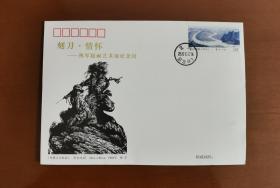《刻刀 情怀—林军版画艺术展纪念封》美术封,C5加厚特种纸烫金印制,贴山水重庆邮票,开幕日加盖重庆美术馆所在地重庆解放碑日戳。重庆市美术家协会、重庆美术馆联合发行,发行量:500枚。封面主图为已故军旅版画家林军先生黑白木刻版画《为独立为解放》,林军是四川版画的第一代领军人物之一。
