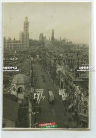 民国上海江西路南京路一带俯瞰全景老照片,左侧远处的高楼是江西中路181号建设大厦又名工投大厦,右侧是新新公司等,拍摄于下午三点前,马路上还有挂着白金龙香烟广告行驶中的有轨电车。