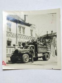 解放初期男女军人在汽车和自行车前留影老照片