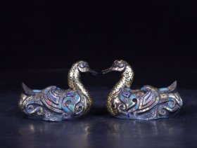 旧藏老铜器铜景泰蓝掐丝鸳鸯一对20/11CM