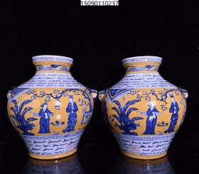 古董古玩瓷器元黄釉青花锦香亭人物故事波斯文兽头罐,高38×34