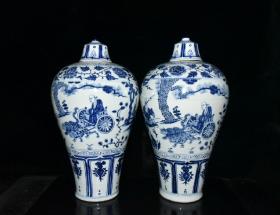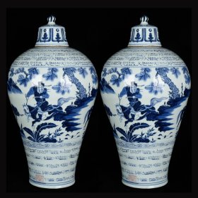 元波斯文青花鬼谷子下山人物故事纹梅瓶一对 古玩古董老瓷器收藏 48.5x25