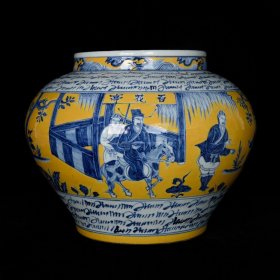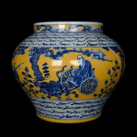 元青花黄釉波斯文款鬼谷子下山人物故事纹罐 高27cm 直径36cm 价1500