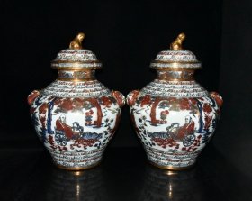 旧藏 元代波斯文青花釉里红描金鬼谷下山人物故事纹盖罐一对【47×35cm】