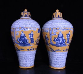 旧藏 元黄釉青花三顾茅庐人物故事波斯文梅瓶一对 高49×27厘米