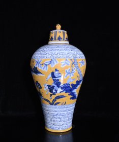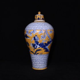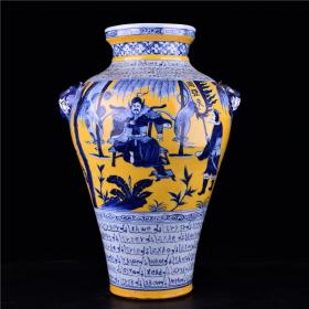 古董元波斯文黄釉青花萧何月下追韩信人物故事纹梅瓶高48×26厘米