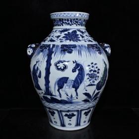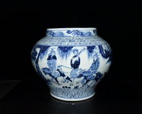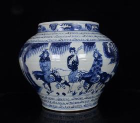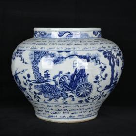 元波斯文青花昭君出塞人物故事纹罐 古玩古董老瓷器收藏 29x35
