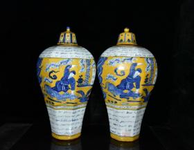 元波斯文黄釉青花武松打虎人物故事纹八方梅瓶一对 49x27