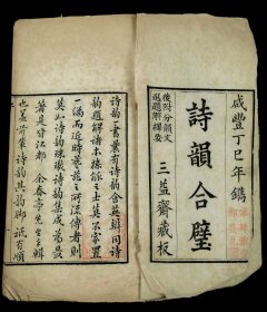 清咸丰白纸精刻《诗韵合璧》原装五卷5厚册全套。毛装,纸白如雪,刻印清晰,小字密而不乱。是书为清代流行的韵书,按上平、下平、上声、去声、入声五声韵排列。书中辑入《诗腋》、《词林典腋》,收词极富。