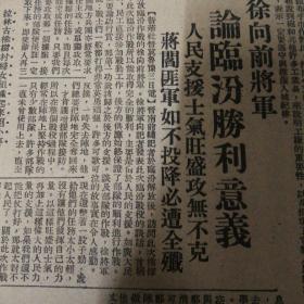 徐向前将军论临汾胜利意义!东北人民解放军各部深入城市教育!蒋区学生爱国运动扩大!宝县新立村生产情况,孙觉民。《东北日报》,1962年北京图书馆影印版