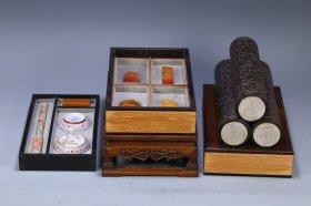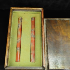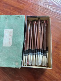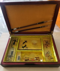 老的约67十年代、《文房四宝》、有机玻璃内嵌有、镇纸2条、黑金鱼4条、黑蟋蟀4只、黄蛐蛐2只、蝴蝶2只、北民小兰竹毛笔1只、纯狼嚎小楷1只、共7件文房用具、未使用过、实木原外盒、基本全新、